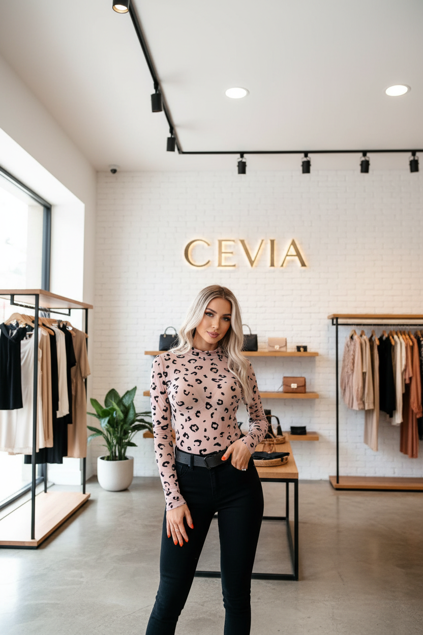 The Léophelle Sheer Rose-Taupe Bodysuit blends refined femininity with bold sophistication — a statement piece designed for the woman who moves with confidence and quiet power. Crafted in a soft rose-taupe hue with a modern sheer finish, its subtle transparency gives the garment a luxurious, feather-light feel while maintaining flawless coverage. The abstract leopard motif brings contemporary allure, balancing elegance with a touch of wild charisma. Its high neckline elongates the silhouette, while the slightly stretchy fabric contours smoothly to the body for a sculpted yet comfortable fit. Perfect for both day and night, this bodysuit elevates everything from tailored trousers to high-waisted denim, creating a polished Parisian-inspired look that stands effortlessly chic under the warm glow of the CEVIA boutique lights.