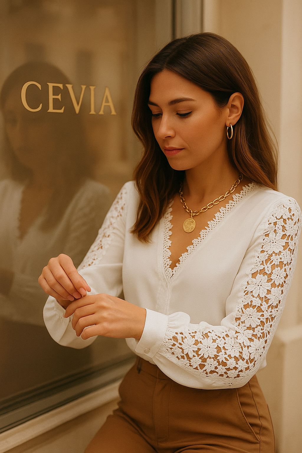 Its gentle V-neck and tailored silhouette create a flattering form, while subtle floral lace brings a touch of romance. Whether paired with caramel trousers or a high-waisted skirt, Amélia moves seamlessly from day to evening — refined, effortless, and distinctively CEVIA. ✨